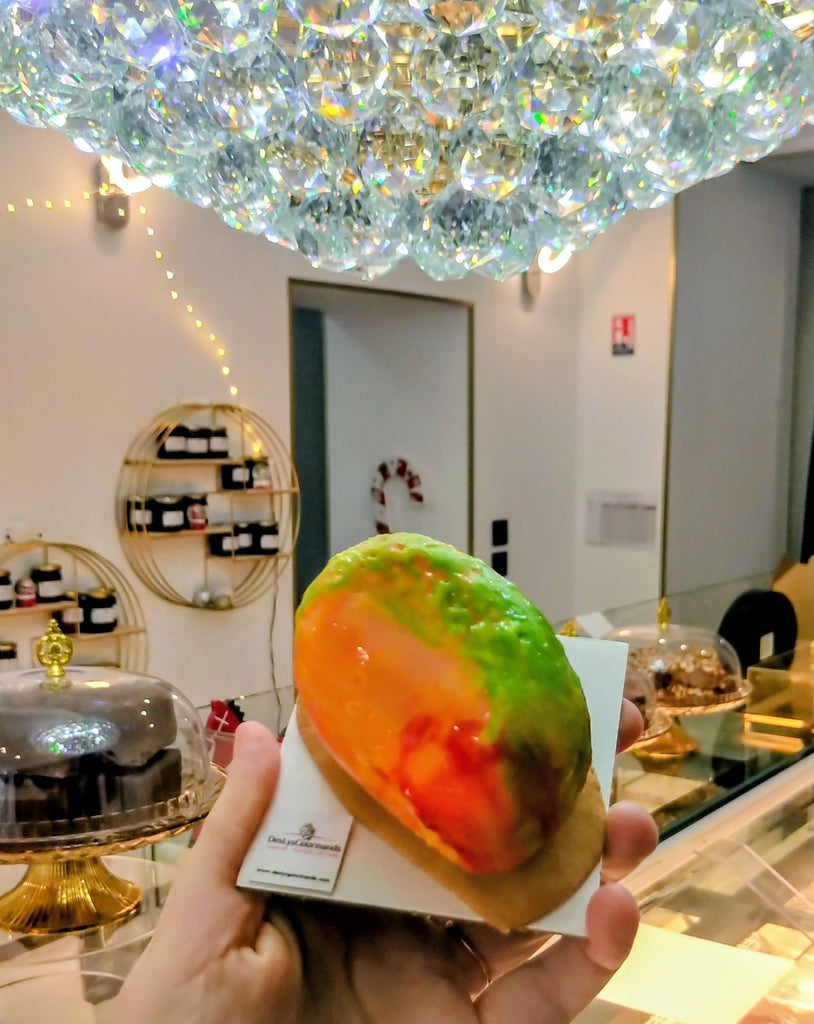 Crémeux mangue, coeur mangue citron vert, biscuit sablé, coque chocolat